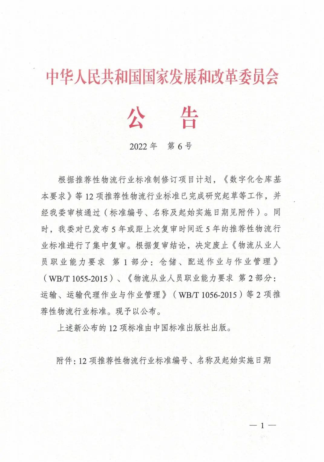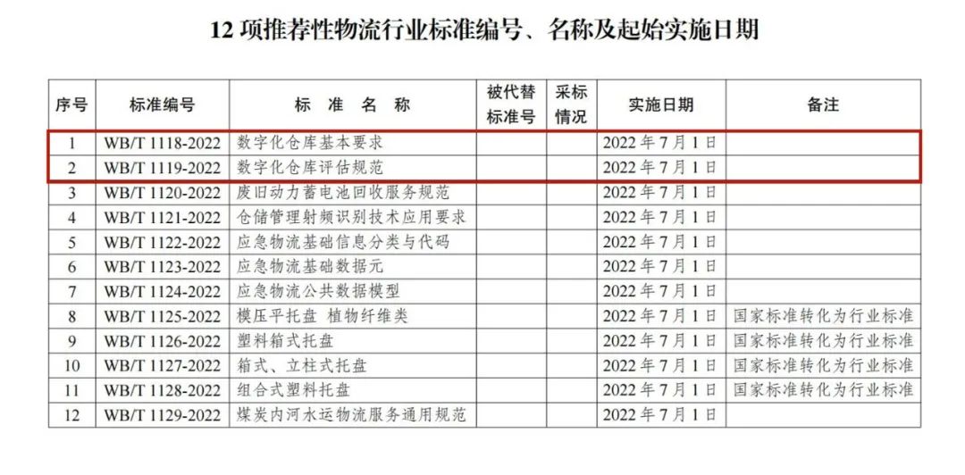 近日,中華人民共和國(guó)國(guó)家發(fā)展和改革委員會(huì)印發(fā)了2022年第6號(hào)公告,批準(zhǔn)發(fā)布12項(xiàng)推薦性物流行業(yè)標(biāo)準(zhǔn)。其中,由廈門(mén)象嶼股份有限公司參與編寫(xiě)的《數(shù)字化倉(cāng)庫(kù)基本要求》(WB/T 1118-2022)《數(shù)字化倉(cāng)庫(kù)評(píng)估規(guī)范》(WB/T 1119-2022)2項(xiàng)推薦性物流行業(yè)標(biāo)準(zhǔn)于2022年7月1日正式實(shí)施。