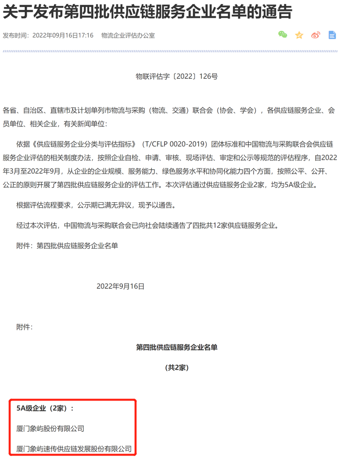最高等級(jí)!象嶼股份及旗下象嶼速傳通過(guò)“5A級(jí)供應(yīng)鏈服務(wù)企業(yè)”評(píng)估